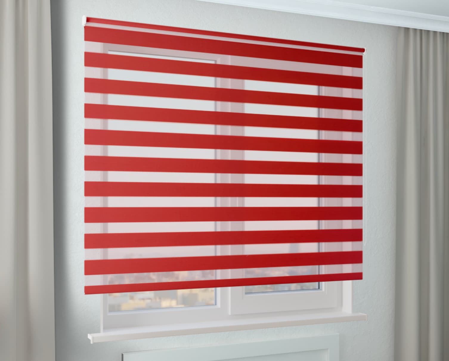 Зебра Стандарт рулонная штора красного цвета отлично защищает от солнечных лучей, поддерживает стиль и гармонию в интерьере. День-ночь функциональность, легкий уход, гипоаллергенная ткань. Бесплатный замер и доставка, гарантия 1 год.