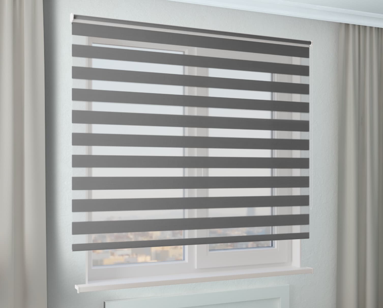 Элегантная рулонная штора Зебра Стандарт в темно-сером цвете. Функционально, стильно, практично, защита от солнечных лучей. Монтаж без сверления, прост в уходе. Гарантия 1 год.