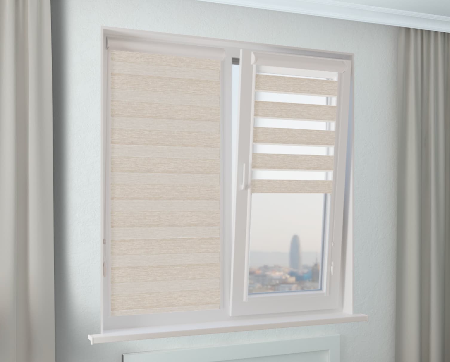 Рулонная штора Зебра УНИ-1 САХАРА светло-бежевый: стильно, практично, защищает от солнца, легко монтируется без сверления.