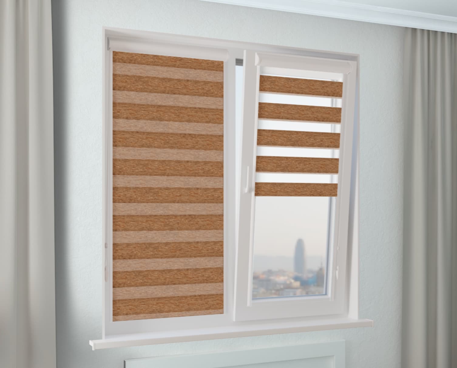 Модная рулонная штора Зебра УНИ-1 для стильного оформления окон в светло-коричневом цвете.