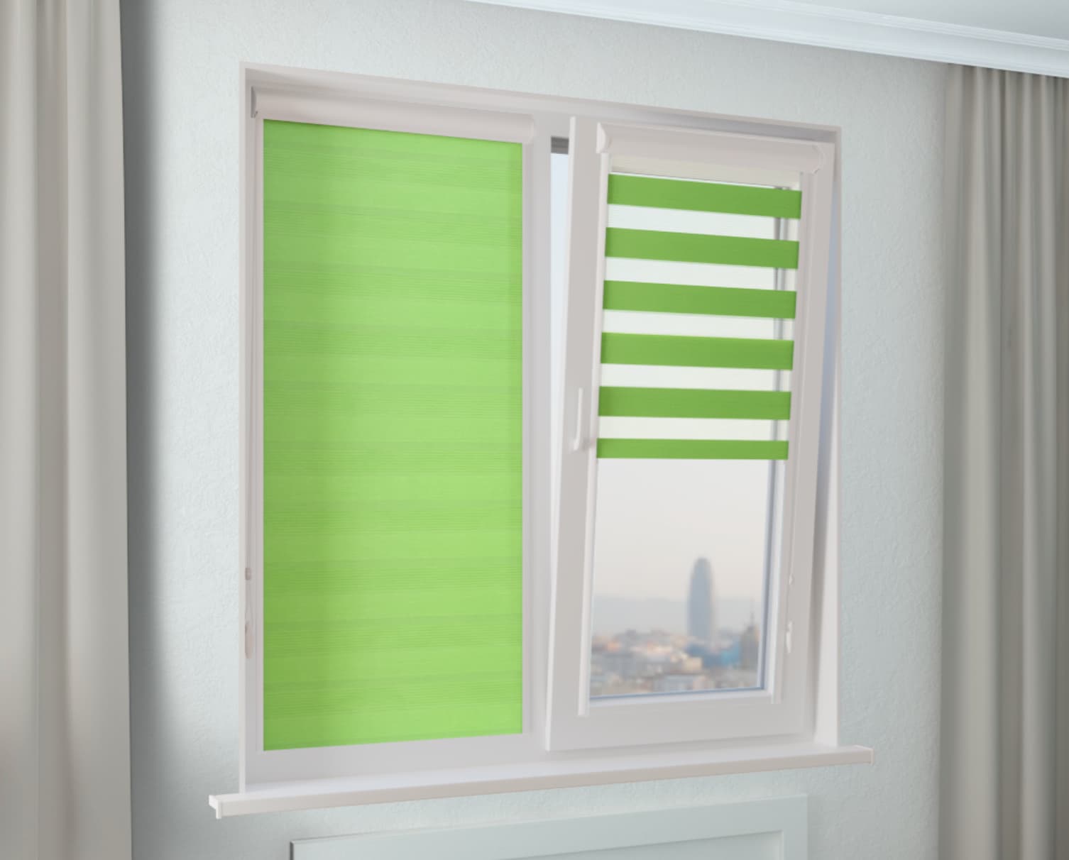 Рулонная штора Зебра УНИ-1 СТАНДАРТ - салатовый. Функциональное день-ночное решение. Эстетично, практично и стильно.